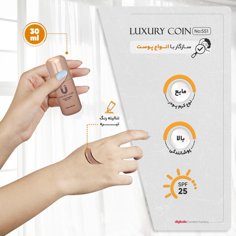 کرم پودر لاکچری کوین برای کسانی است که به صورت خود برای آرایش زیادحساس هستند. این برند آرایشی را سخت پسندان لوازم آرایشی به راحتی با آن کنار می آیند. قدرت پوشانندگی بسیاربالا، بافت سبک ازخصوصیات این محصول است. کرم پودر لاکچری کوین دارای پد مخصوص می باشد.کرم پودر کوین پایه سیلیکونی می باشد.واترپروف یا ضد آب یکی دیگر از مزایای این کرم پودر قوی و خوب می باشد. پوشش بالا روی پوست و همچنین ایجاد پوشش مخملی را می توان ازدیگر موارد مهم این کرم پودر دانست.ست کرم پودر لاکچری کوین دارایSPF 25 می باشد.کرم پودر لاکچری کوین بدون بو بوده وحاوی ویتامین E است. از دیگر خصوصیات کرم پودر لاکچری کوین می توان به قدرت پوشانندگی خط لبخند و خط اخم آن اشاره کرد.بافت بسیار سبکی بر روی پوست دارد و جذب آن کمتر از 50 ثانیه اتفاق می افتد.